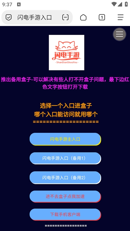 1. 下载安装应用后,可选择主入口或备用入口进入游戏盒子;若遇到无法进入的情况,点击“进不去盒子点我加速”尝试修复连接。