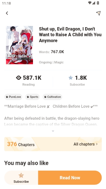 3. 选择任意小说(例如《Shut up, Evil Dragon, I Don't Want to Raise A Child with You Anymore》),进入详情页查看字数、阅读量、标签及剧情简介。