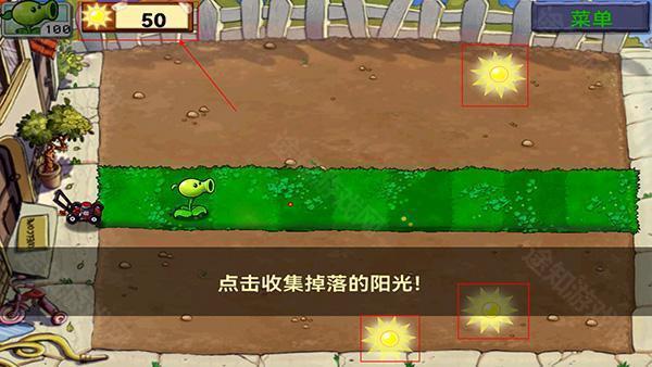 2、拾取出现的植物卡片(如豌豆射手),点击草坪即可种植,建立第一道防线;