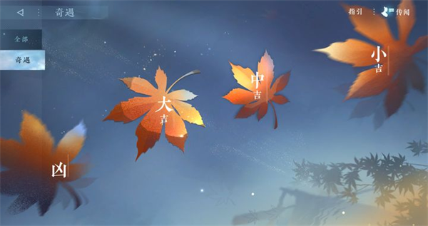 通过右上角【菜单】→【开放世界】→【奇遇】进入界面。奇遇分为大吉、中吉、小吉三类(凶类暂未开放),界面显示总数,约半数名称初始隐藏,需触发后方可显示。