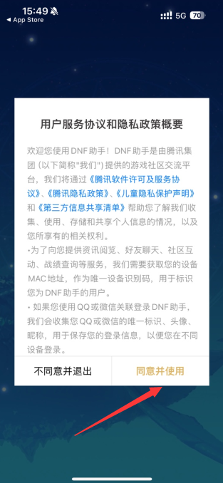1. 从本站下载安装DNF助手APP后,打开应用并点击“同意”用户协议。