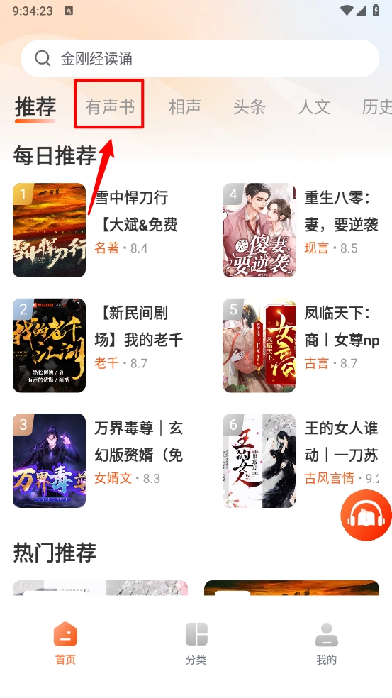 2、点击首页中的“有声书”分类入口(如图所示)。