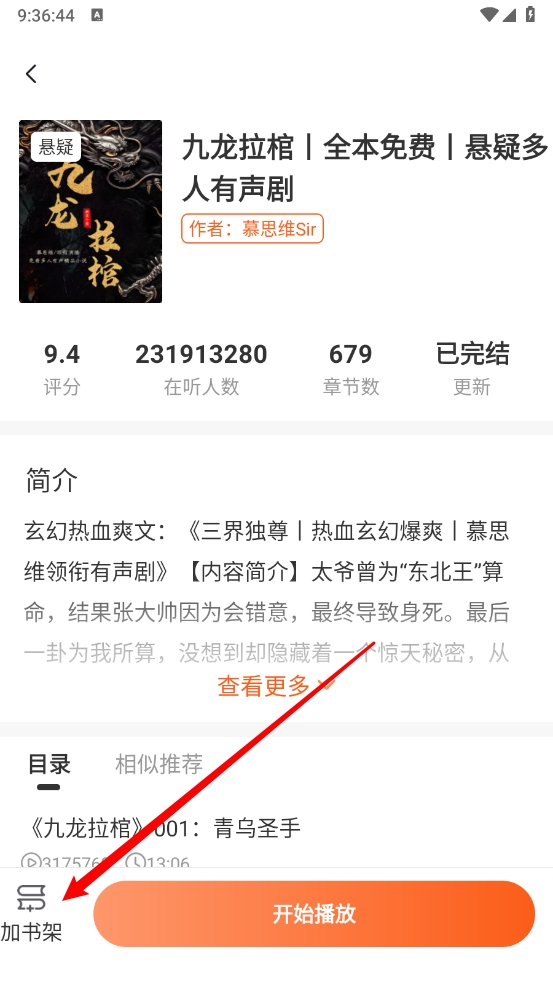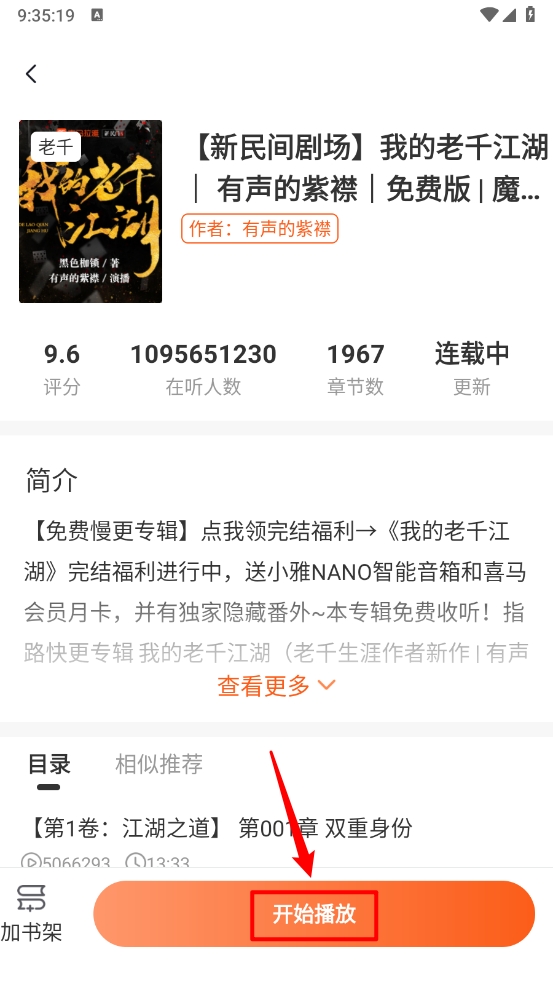 4、进入小说详情页后,点击“开始播放”按钮即可收听。