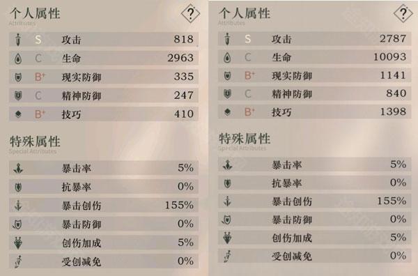 先来比一下个人属性:左侧是狼群1级的面板,右侧是狼群洞悉一30级的面板。