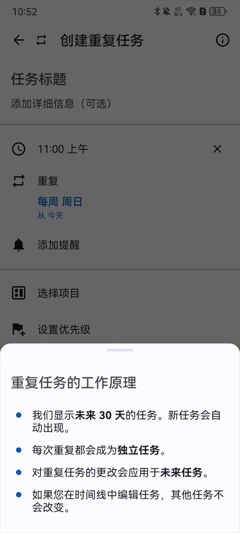 轻松设定每日晨读、每周复盘、每月账单日等固定节奏,支持高度自定义周期(如“每3天”“每月第2个工作日”)。Taskito 会自动创建对应任务,无需手动打卡,让好习惯自然融入生活。