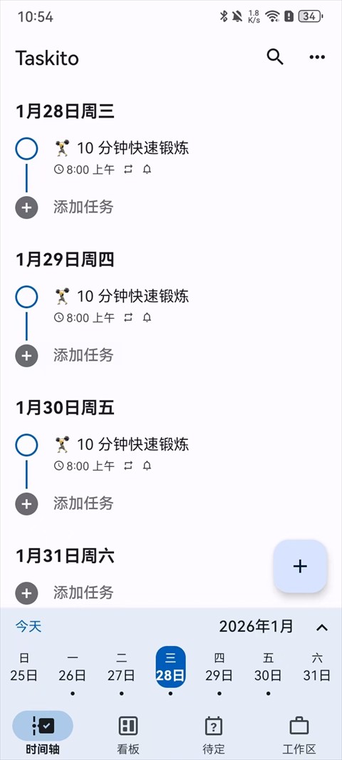 Taskito是一款专注于日程管理的生活实用类软件,支持创建临时任务、重复任务等各类待办事项,并以清晰的时间轴展示。它会在合适时间智能提醒,界面简洁、分区明确,助你高效规划每一天。