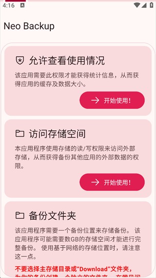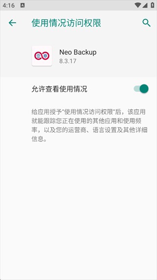 3、根据指引跳转至系统设置页面,开启所需权限后返回 NeoBackup 即可。