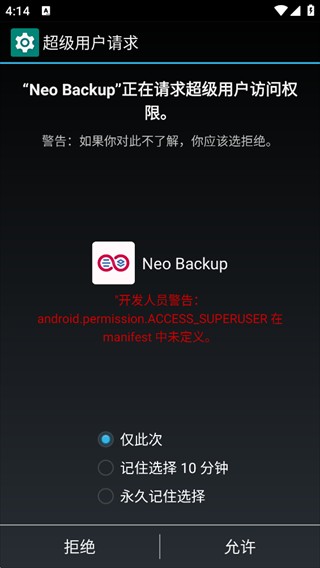 1、首次启动 NeoBackup 时,系统会请求 Root 权限。如果你的设备已成功 Root,请点击允许以继续使用全部功能。