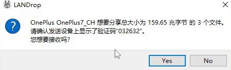 4、电脑端将弹出接收确认窗口,点击“Yes”即可开始接收文件。