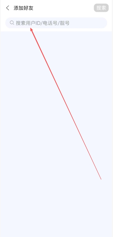 在添加好友页面中,输入对方的用户ID、手机号或靓号,点击搜索即可发送好友申请。