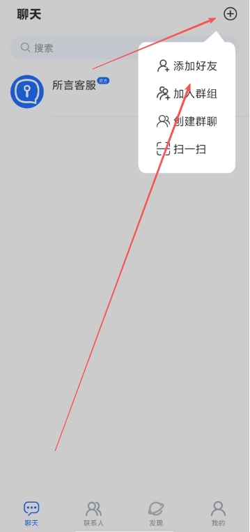 打开所言APP,在聊天主页面点击右上角“+”号,选择“添加好友”选项。