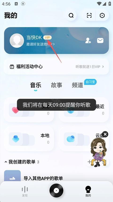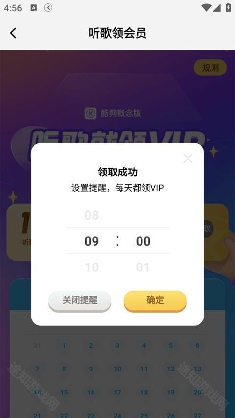 3. 点击【点击即领】按钮,还可开启签到提醒,每日听歌即可免费获取VIP权益;