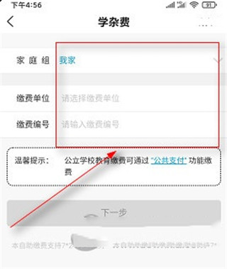 3、输入对应缴费单位名称及学生编号,确认信息无误后点击【下一步】,按提示完成支付即可。