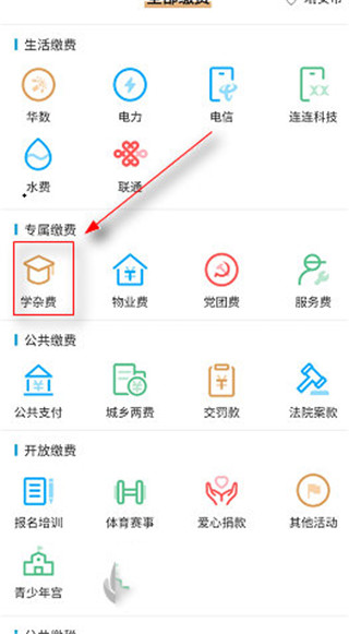 2、进入后选择【专属缴费】,即可看到“学杂费”选项。