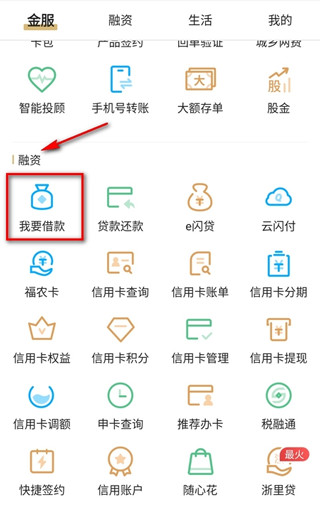 2、在功能列表中找到【融资】板块,点击【我要借款】即可进入申请流程。