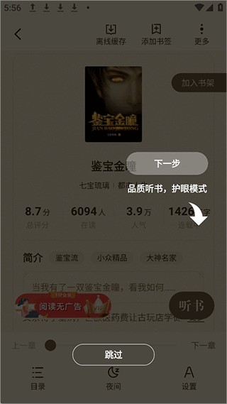答:打开听书模式后,在播放界面找到语音设置选项,里面提供多种不同风格的音色可供选择,选择后就能立即切换,找到自己喜欢的播报声音。