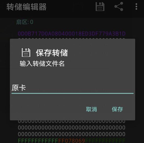确认数据无误后,点击右上角“保存”按钮,将原卡数据保存为转储文件,便于后续写入目标卡。
