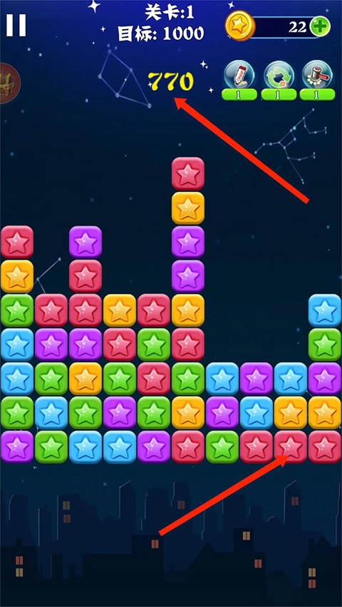 4、屏幕上方实时显示【当前分数】,建议优先消除三颗及以上同色星星,以获取更高分值,更快接近目标。