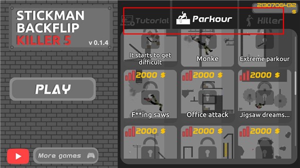 1、打开火柴人空翻5国际服,点击左侧“PLAY”按钮,随后在右侧选择你喜欢的游戏模式。
