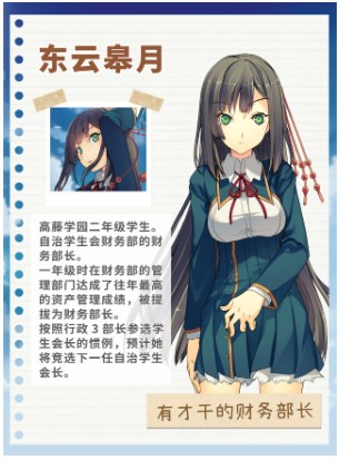 私立高藤学园二年级生,现任自治学生会财务部部长。