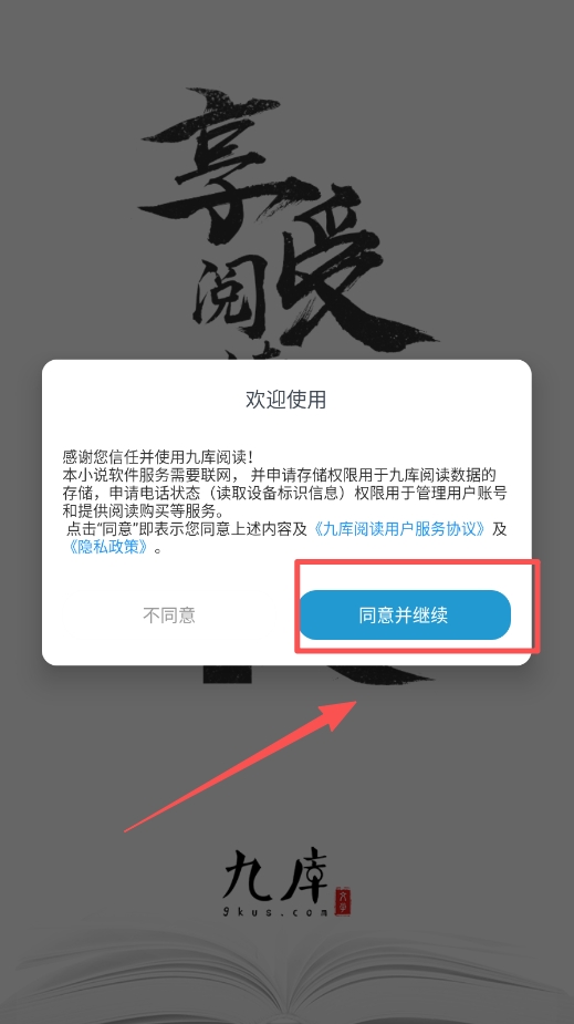 首次打开九库阅读最新版本,需点击“同意并继续”,并授权网络与存储权限,以确保正常加载书籍内容及使用书架、购买等功能。