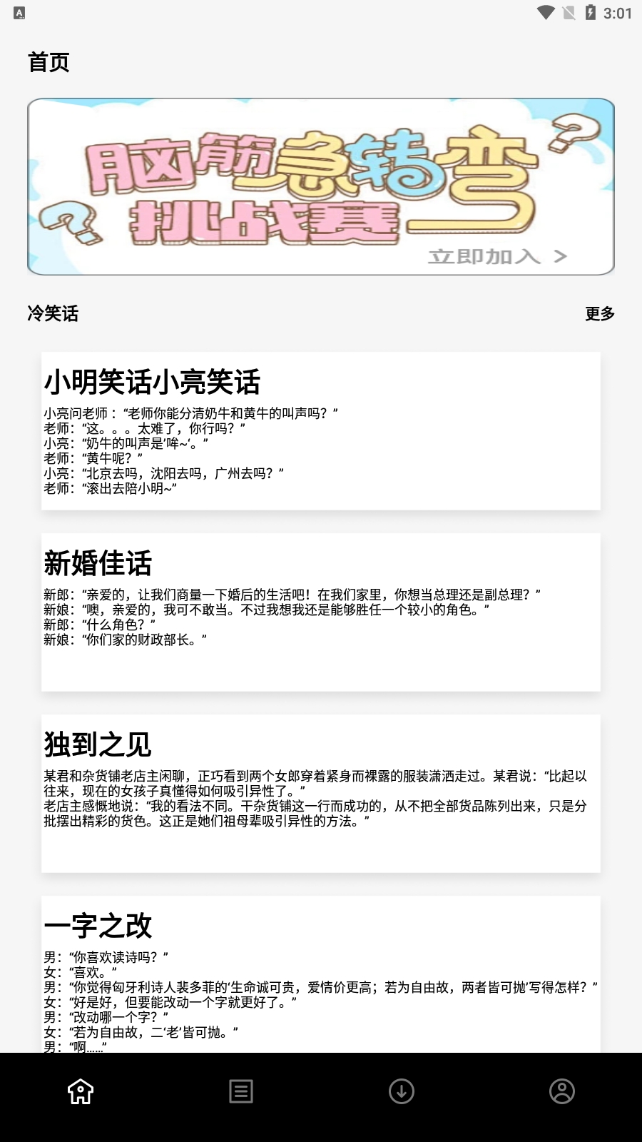 七只猫小说每日更新短笑话、趣味谜题和新鲜资讯,内容轻松有趣,特别适合在通勤、午休等碎片时间快速浏览。