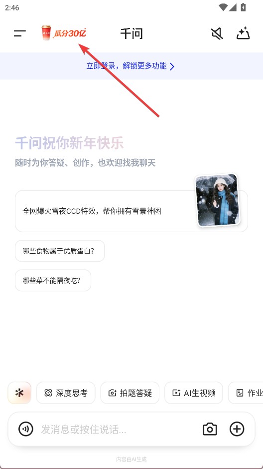 2、打开最新版千问App,首页顶部直接显示“瓜分30亿”活动横幅,点击即可参与。