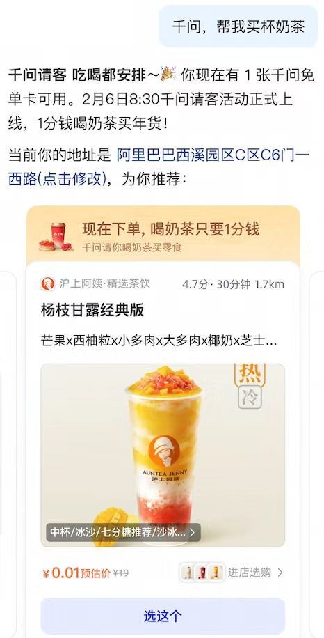 背靠阿里生态资源,千问已接入数十万家线下茶饮及零售门店,结合专属红包与优惠活动,让AI能力转化为实实在在的生活便利与实惠。
