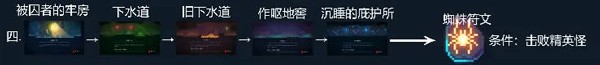 路线为:“被囚者牢房”→“猛毒下水道”→利用牧羊符文进入“旧下水道”→“作呕地窖”→“沉睡庇护所”,击败该区域的精英敌人后获得蜘蛛符文。