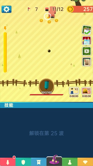 技能系统将在第25波解锁,可释放大范围伤害或控制类技能,有效应对密集怪物潮。