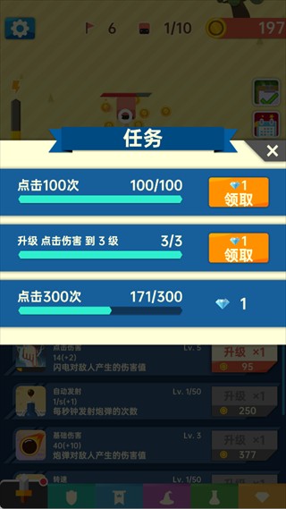 完成指定任务(例如点击100次、将点击伤害升至3级等)可领取钻石奖励。钻石可用于解锁高级功能或购买稀有道具,建议优先完成简单任务,快速积累资源。
