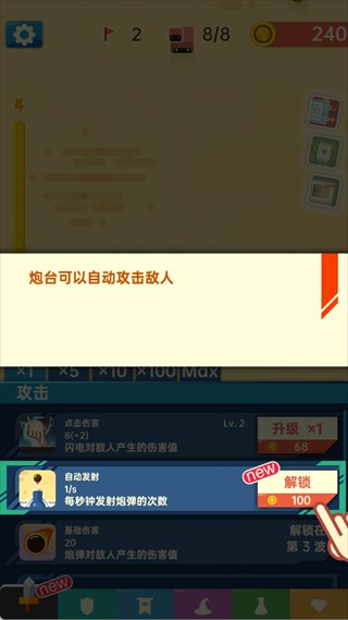 成功通关第2波后,可花费100金币解锁自动发射功能,炮台将每秒自动发射炮弹攻击敌人。后续还能对自动系统进行多维度升级: