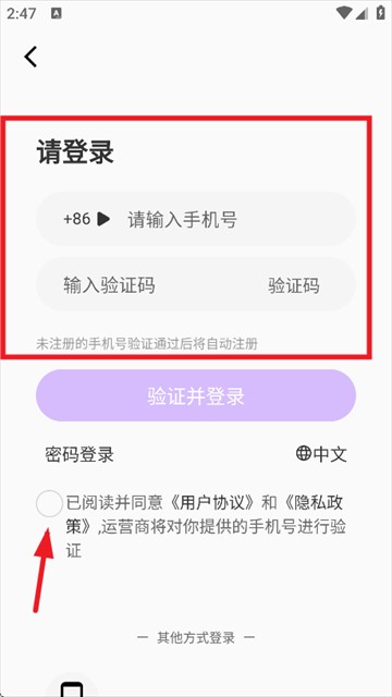 3、输入手机号和验证码,勾选用户协议和隐私政策即可
