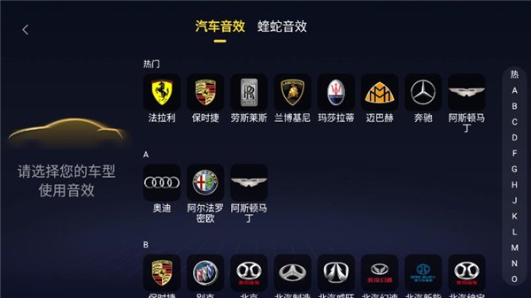 进入音效设置页面后,选择你的具体车型,系统将自动匹配适配音效方案。