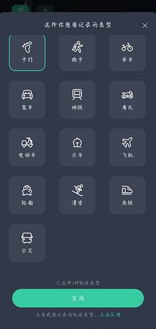 3、可以选择足迹记录的类型,例如步行,跑步,单车,驾车等多种方式,设置好了点击开始即可