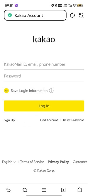 3、输入您的Kakao账号与密码,点击登录完成注册流程。
