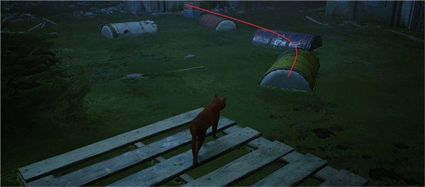 首先避开下方看似危险的水池,借助废弃油桶与空调外机跳跃前行,向右前方推进。