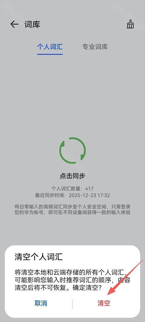 3. 选择【个人词汇】,点击右上角的清除按钮;