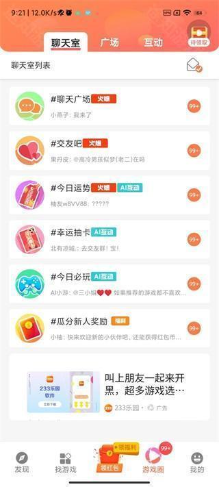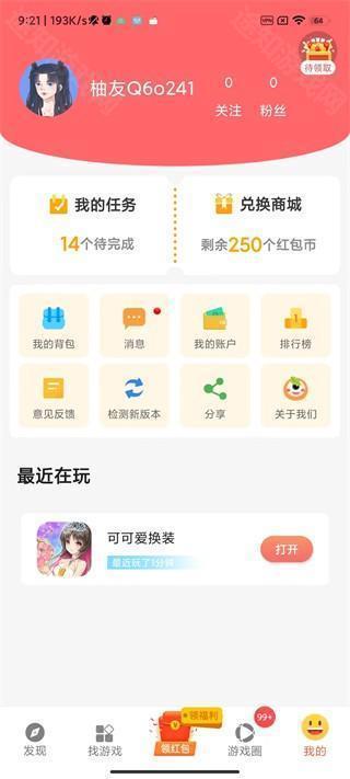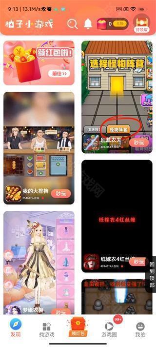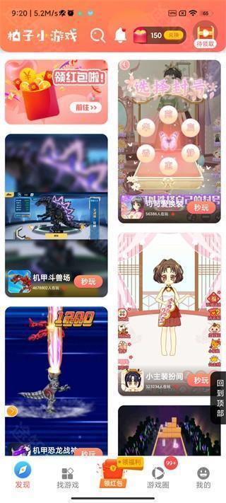 1、安装并打开应用后,主界面包含发现、找游戏、领红包、游戏圈、我的五大功能板块;