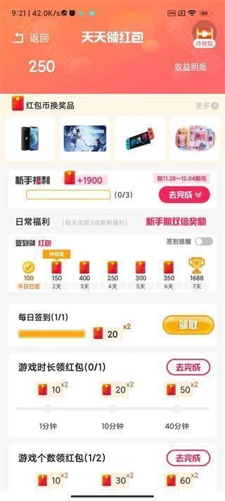 4、每日签到或完成指定任务可领取金币,兑换红包奖励;
