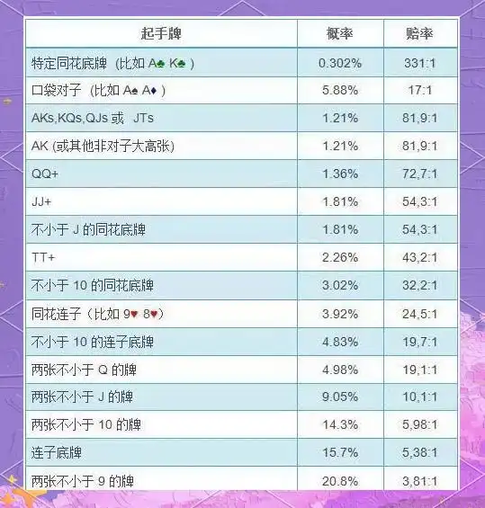 在扑克的世界中,数学基础,尤其是概率论,对提升德州扑克技巧至关重要。在本文中,我们将深入剖析翻牌前特定起手牌出现的概率,从而帮助玩家在牌桌上做出更优决策。
