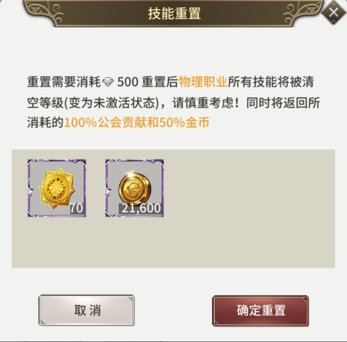 - 可重置技能,返还50%金币与100%贡献,首次重置仅需300钻石;