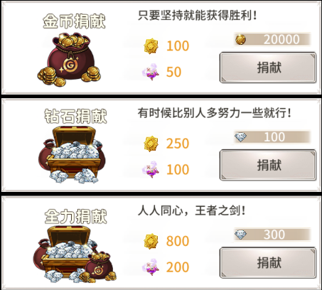 - 0点重置次数,捐献获公会经验与贡献;当日换公会后不可再捐;达指定活跃度可领宝箱。
