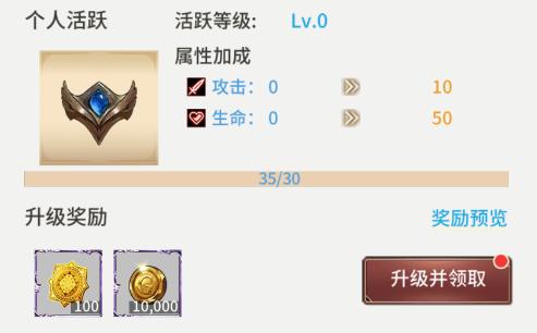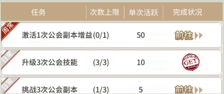 - 活跃点用于升级,提升属性加成并领取公会积分与金币。