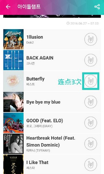 - 选择喜爱的歌曲,可连续点击三次进行投票