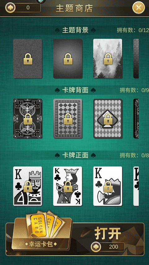 支持自定义主界面背景、卡牌正面与背面图案。点击“OPEN”花费200金币解锁皮肤;重复获取时弹窗提示并返还100金币。左右滑动浏览更多皮肤,已拥有数量实时显示。未解锁皮肤呈灰色锁定状态,点击可查看大图及解锁条件;已拥有皮肤则标注“已拥有”并支持预览。