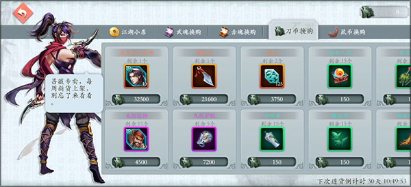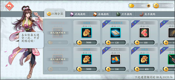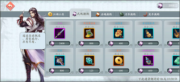 - 武魂换购(武魂购买,每周刷新):武魂来源为重复获取侠客或分解信物(3星信物=5武魂)。优先兑换养成材料、金币;有抽卡需求可换寻访券或龙玉。