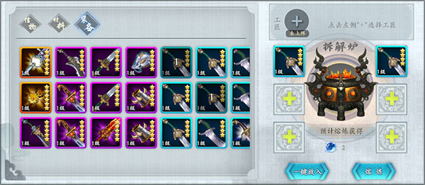 - 熔炼坊:分解信物得武魂(用于武魂商店),分解武器得精华(用于强化)。注意:仅当侠客潜能满级后才可分解其信物。
