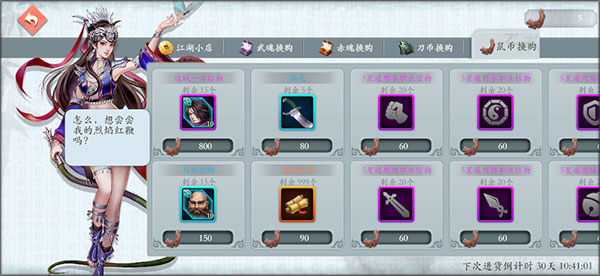 - 赤魂换购(赤魂购买,每月刷新):赤魂来自首次获取侠客或分解高星信物(6星信物=10赤魂)。首选直接兑换6星侠客;前期可换寻访券,后期换职业信物提升潜能。