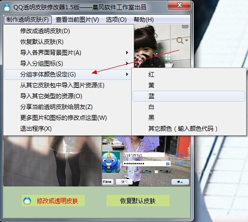 如需调整联系人分组的字体颜色,可进入“制作透明皮肤”菜单,点击“分组字体颜色设定”。系统将提供5种基础颜色选项,同时也支持自定义配色。